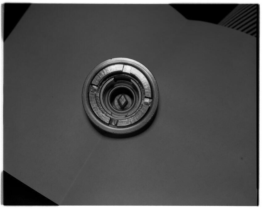 Negative, sheet film. 4 x 5 b&w. No. 1541. Top of tap device for keg.