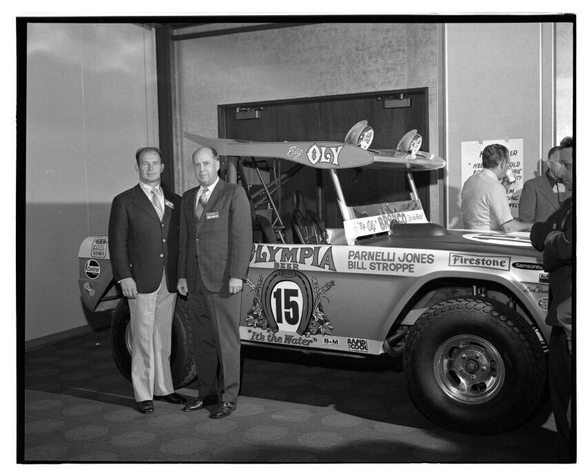 Negative, sheet film. 2 x 3 b&w. 72.131. Olympia brewery sponsored "Big Oly" race car (in races like Baja 500) driven by Parnelli Jones and Bill Stroppe. Jones is man in dark jacket and striped pants. No ID on others. Unknown location.Name/Title