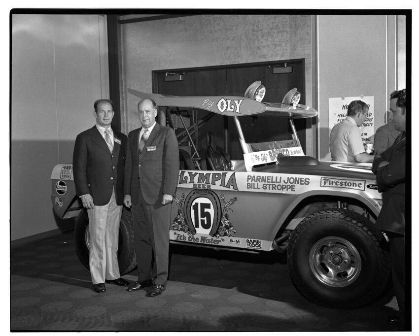 Negative, sheet film. 2 x 3 b&w. 72.131. Olympia brewery sponsored "Big Oly" race car (in races like Baja 500) driven by Parnelli Jones and Bill Stroppe. Jones is man in dark jacket and striped pants. No ID on others. Unknown location.Name/Title