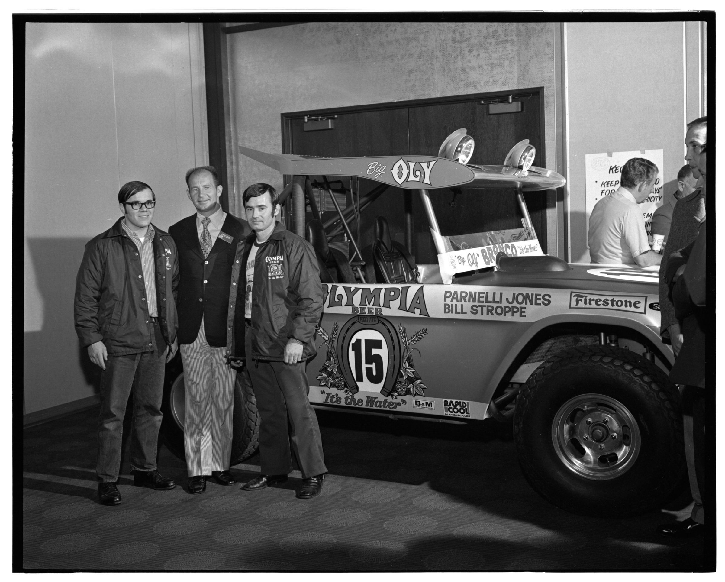 Negative, sheet film. 2 x 3 b&w. 72.131. Olympia brewery sponsored "Big Oly" race car (in races like Baja 500) driven by Parnelli Jones and Bill Stroppe. Jones is man in dark jacket and striped pants. No ID on others. Unknown location.Name/Title