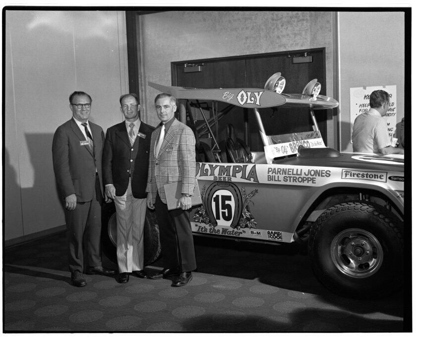 Negative, sheet film. 2 x 3 b&w. 72.131. Olympia brewery sponsored "Big Oly" race car (in races like Baja 500) driven by Parnelli Jones and Bill Stroppe. Jones is man in dark jacket and striped pants. No ID on others. Unknown location.Name/Title