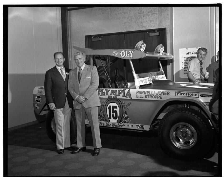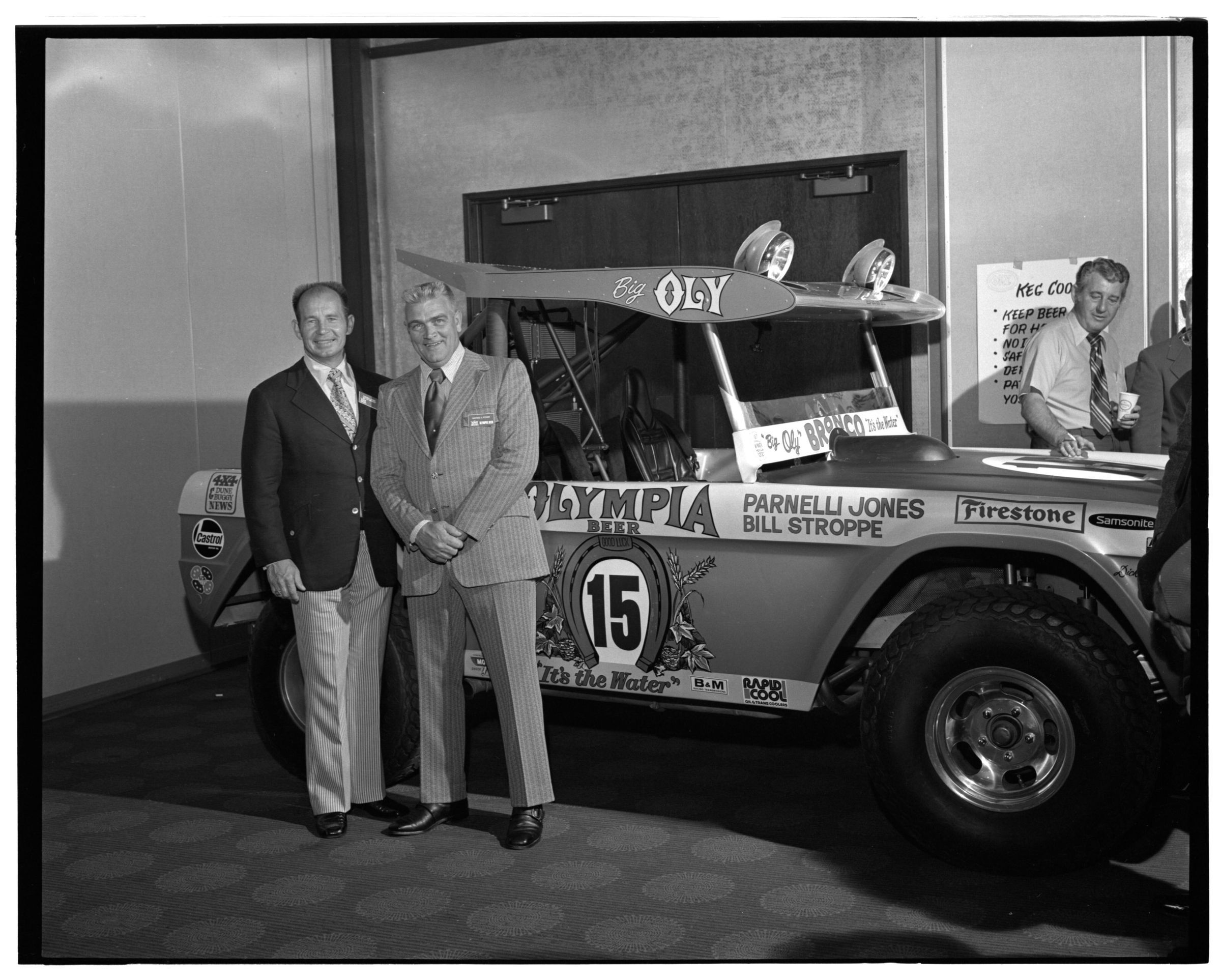 Negative, sheet film. 2 x 3 b&w. 72.131. Olympia brewery sponsored "Big Oly" race car (in races like Baja 500) driven by Parnelli Jones and Bill Stroppe. Jones is man in dark jacket and striped pants. No ID on others. Unknown location.Name/Title