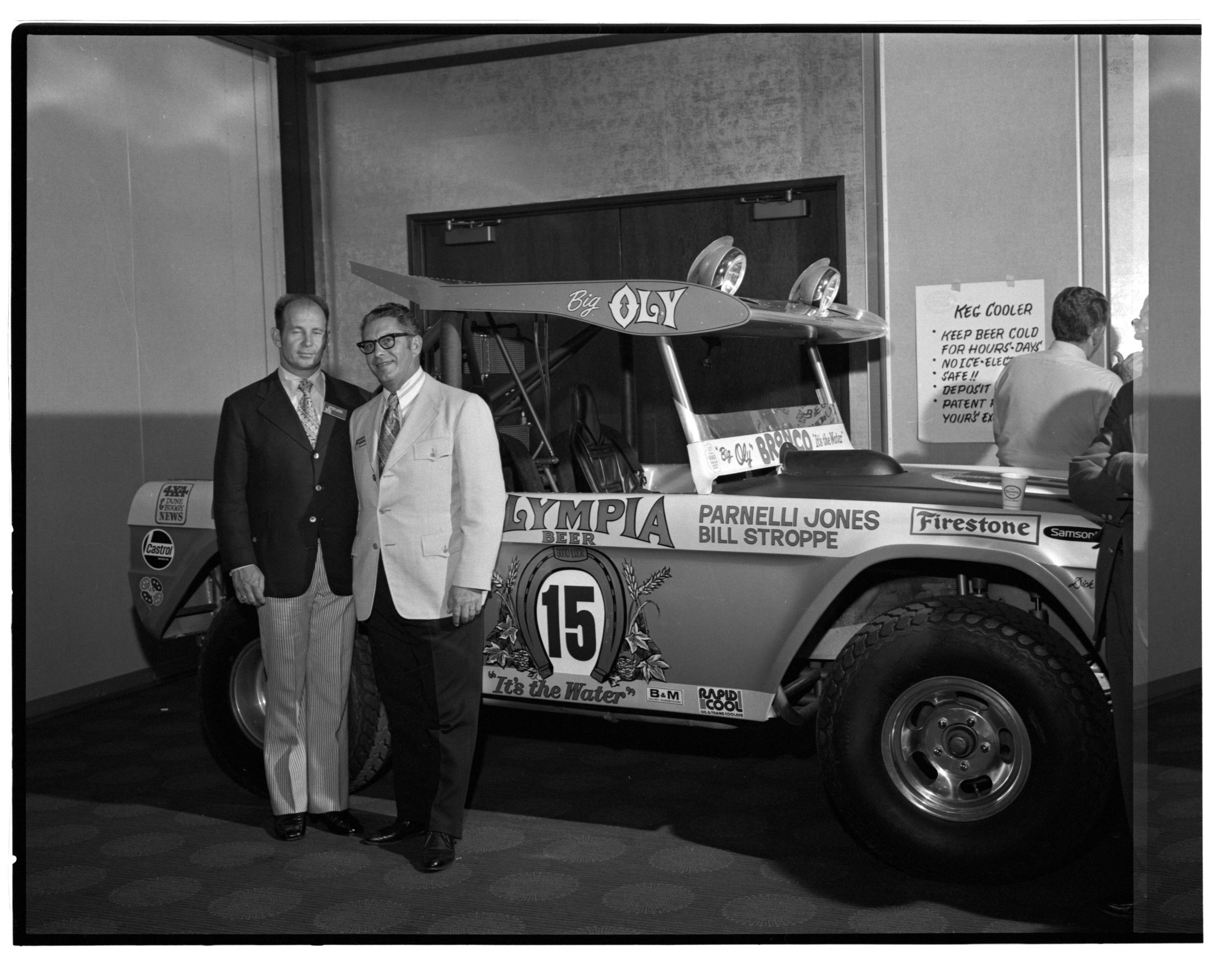 Negative, sheet film. 2 x 3 b&w. 72.131. Olympia brewery sponsored "Big Oly" race car (in races like Baja 500) driven by Parnelli Jones and Bill Stroppe. Jones is man in dark jacket and striped pants. No ID on others. Unknown location.Name/Title
