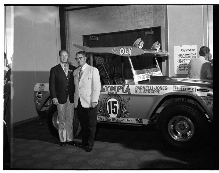 Negative, sheet film. 2 x 3 b&w. 72.131. Olympia brewery sponsored "Big Oly" race car (in races like Baja 500) driven by Parnelli Jones and Bill Stroppe. Jones is man in dark jacket and striped pants. No ID on others. Unknown location.Name/Title