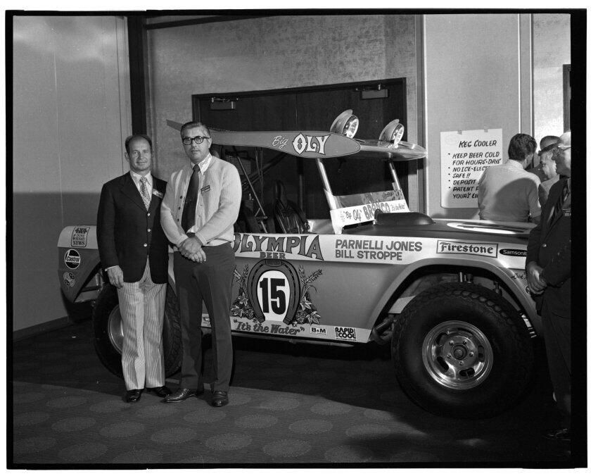 Negative, sheet film. 2 x 3 b&w. 72.131. Olympia brewery sponsored "Big Oly" race car (in races like Baja 500) driven by Parnelli Jones and Bill Stroppe. Jones is man in dark jacket and striped pants. No ID on others. Unknown location.Name/Title