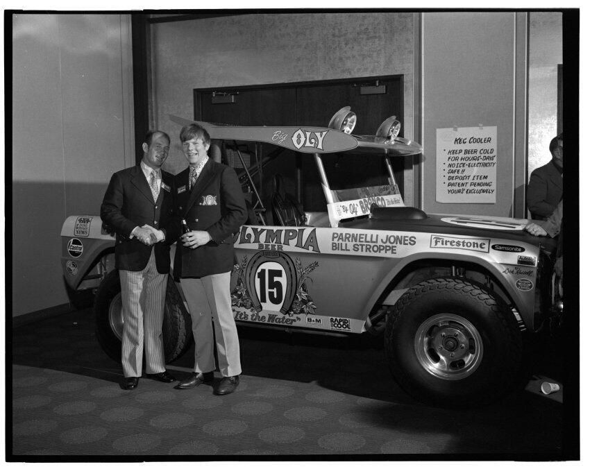 Negative, sheet film. 2 x 3 b&w. 72.131. Olympia brewery sponsored "Big Oly" race car (in races like Baja 500) driven by Parnelli Jones and Bill Stroppe. Jones is man in dark jacket and striped pants. No ID on others. Unknown location.Name/Title