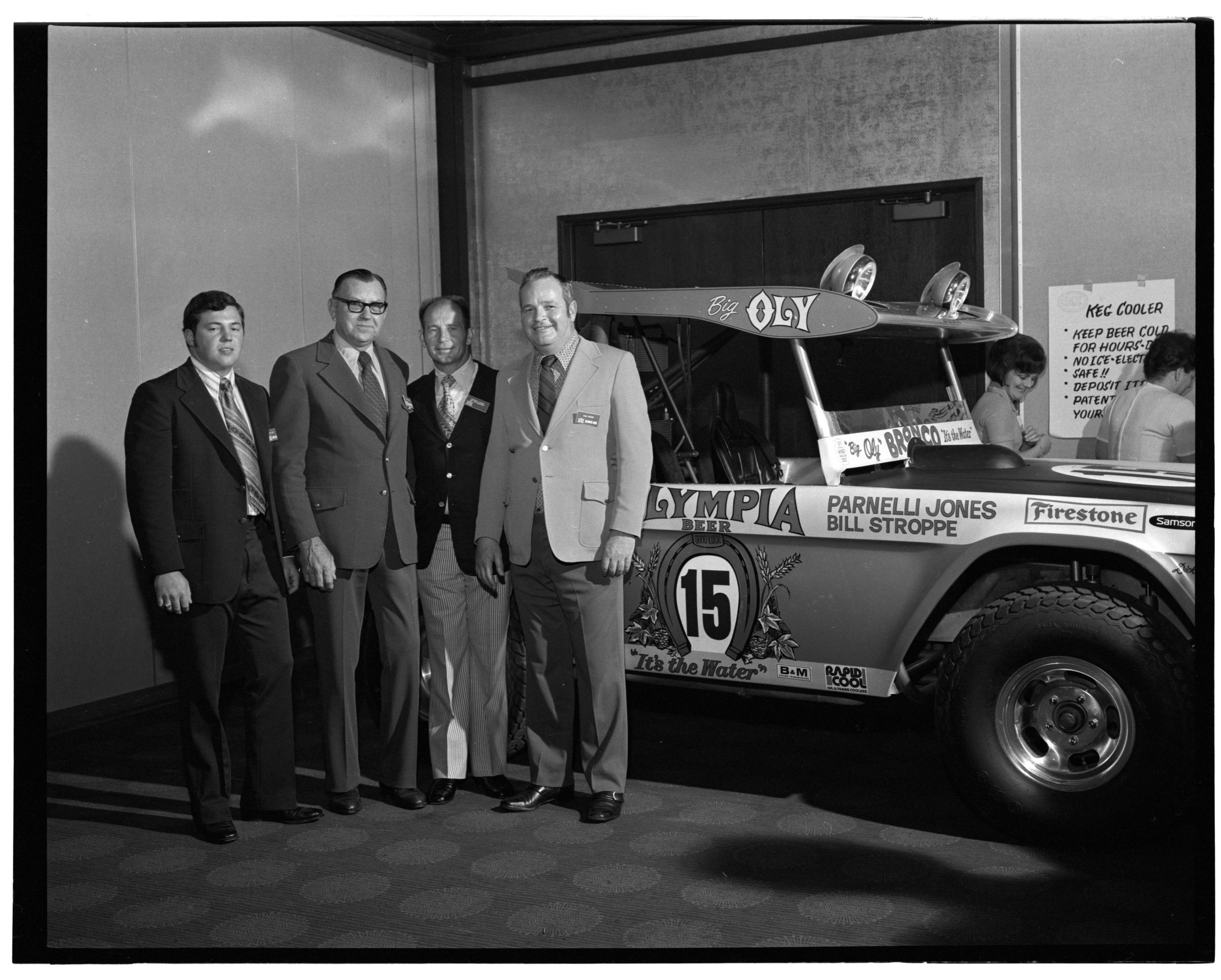 Negative, sheet film. 2 x 3 b&w. 72.131. Olympia brewery sponsored "Big Oly" race car (in races like Baja 500) driven by Parnelli Jones and Bill Stroppe. Jones is man in dark jacket and striped pants. No ID on others. Unknown location.Name/Title