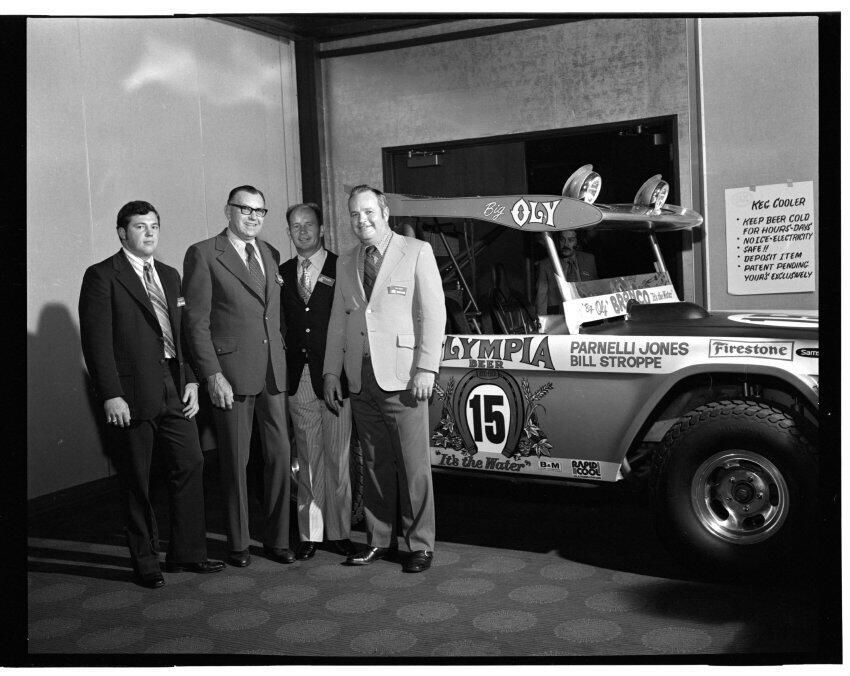 Negative, sheet film. 2 x 3 b&w. 72.131. Olympia brewery sponsored "Big Oly" race car (in races like Baja 500) driven by Parnelli Jones and Bill Stroppe. Jones is man in dark jacket and striped pants. No ID on others. Unknown location.Name/Title