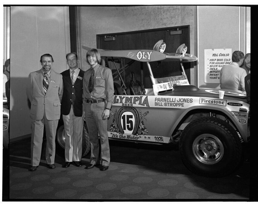 Negative, sheet film. 2 x 3 b&w. 72.131. Olympia brewery sponsored "Big Oly" race car (in races like Baja 500) driven by Parnelli Jones and Bill Stroppe. Jones is man in dark jacket and striped pants. No ID on others. Unknown location.Name/Title