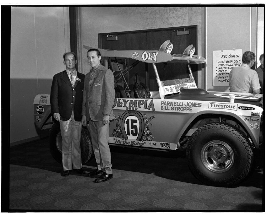Negative, sheet film. 2 x 3 b&w. 72.131. Olympia brewery sponsored "Big Oly" race car (in races like Baja 500) driven by Parnelli Jones and Bill Stroppe. Jones is man in dark jacket and striped pants. No ID on others. Unknown location.Name/Title