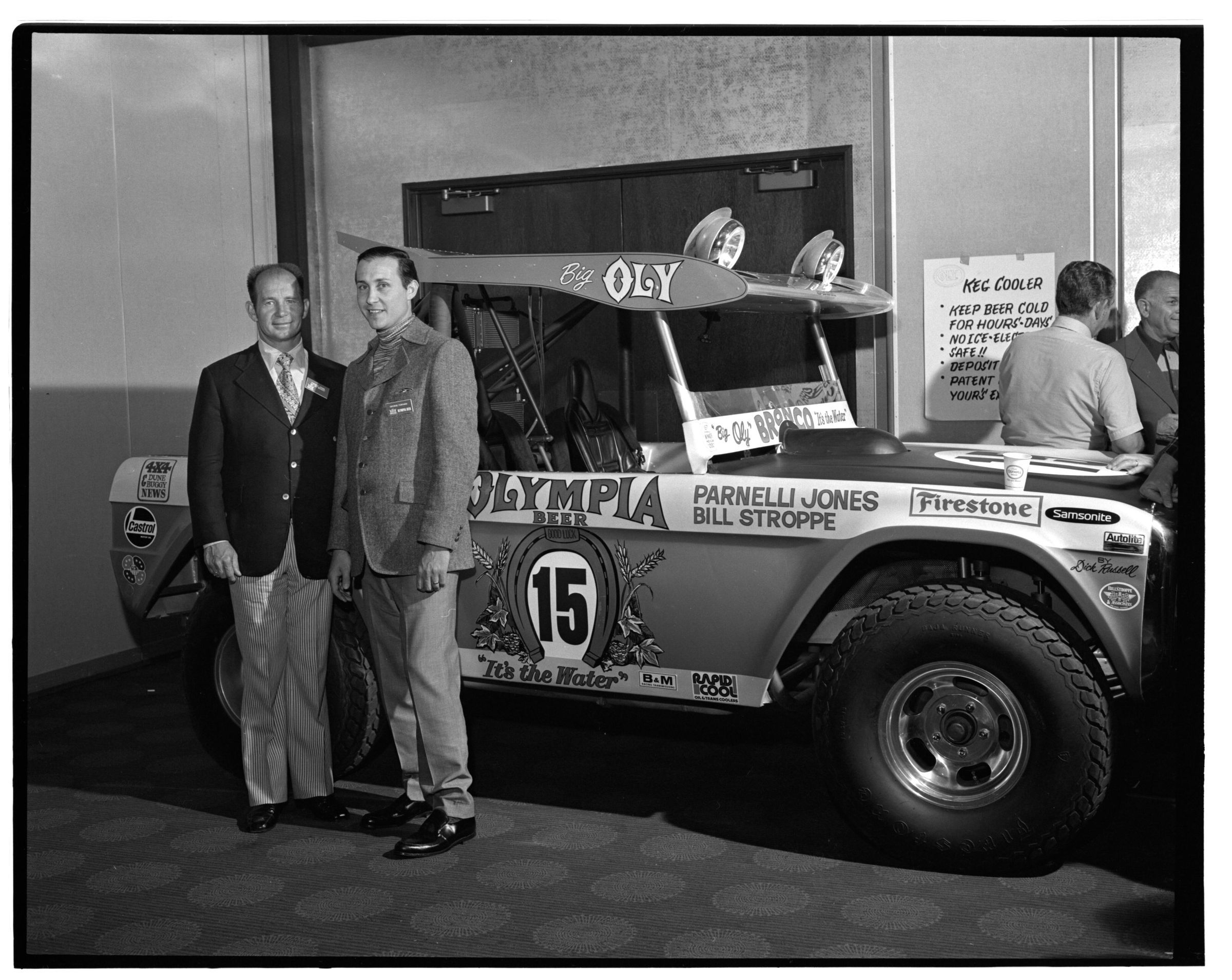 Negative, sheet film. 2 x 3 b&w. 72.131. Olympia brewery sponsored "Big Oly" race car (in races like Baja 500) driven by Parnelli Jones and Bill Stroppe. Jones is man in dark jacket and striped pants. No ID on others. Unknown location.Name/Title