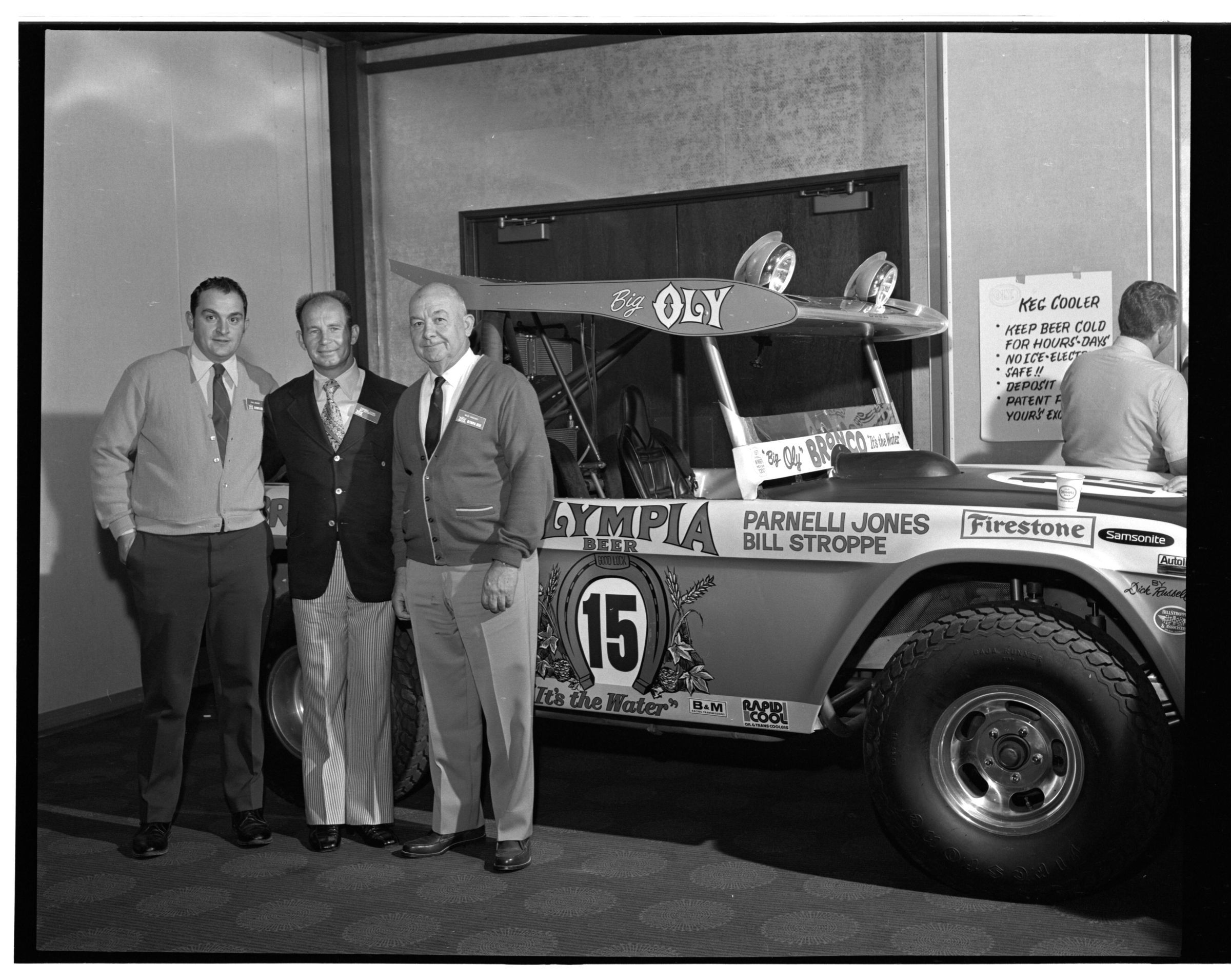 Negative, sheet film. 2 x 3 b&w. 72.131. Olympia brewery sponsored "Big Oly" race car (in races like Baja 500) driven by Parnelli Jones and Bill Stroppe. Jones is man in dark jacket and striped pants. No ID on others. Unknown location.Name/Title
