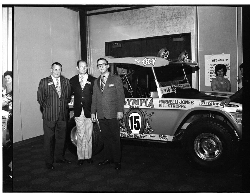 Negative, sheet film. 2 x 3 b&w. 72.131. Olympia brewery sponsored "Big Oly" race car (in races like Baja 500) driven by Parnelli Jones and Bill Stroppe. Jones is man in dark jacket and striped pants. No ID on others. Unknown location.Name/Title