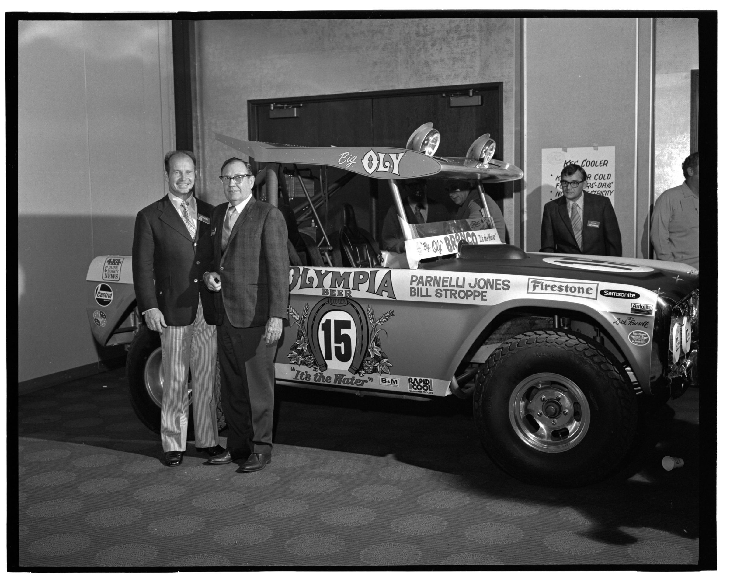 Negative, sheet film. 2 x 3 b&w. 72.131. Olympia brewery sponsored "Big Oly" race car (in races like Baja 500) driven by Parnelli Jones and Bill Stroppe. Jones is man in dark jacket and striped pants. No ID on others. Unknown location.Name/Title