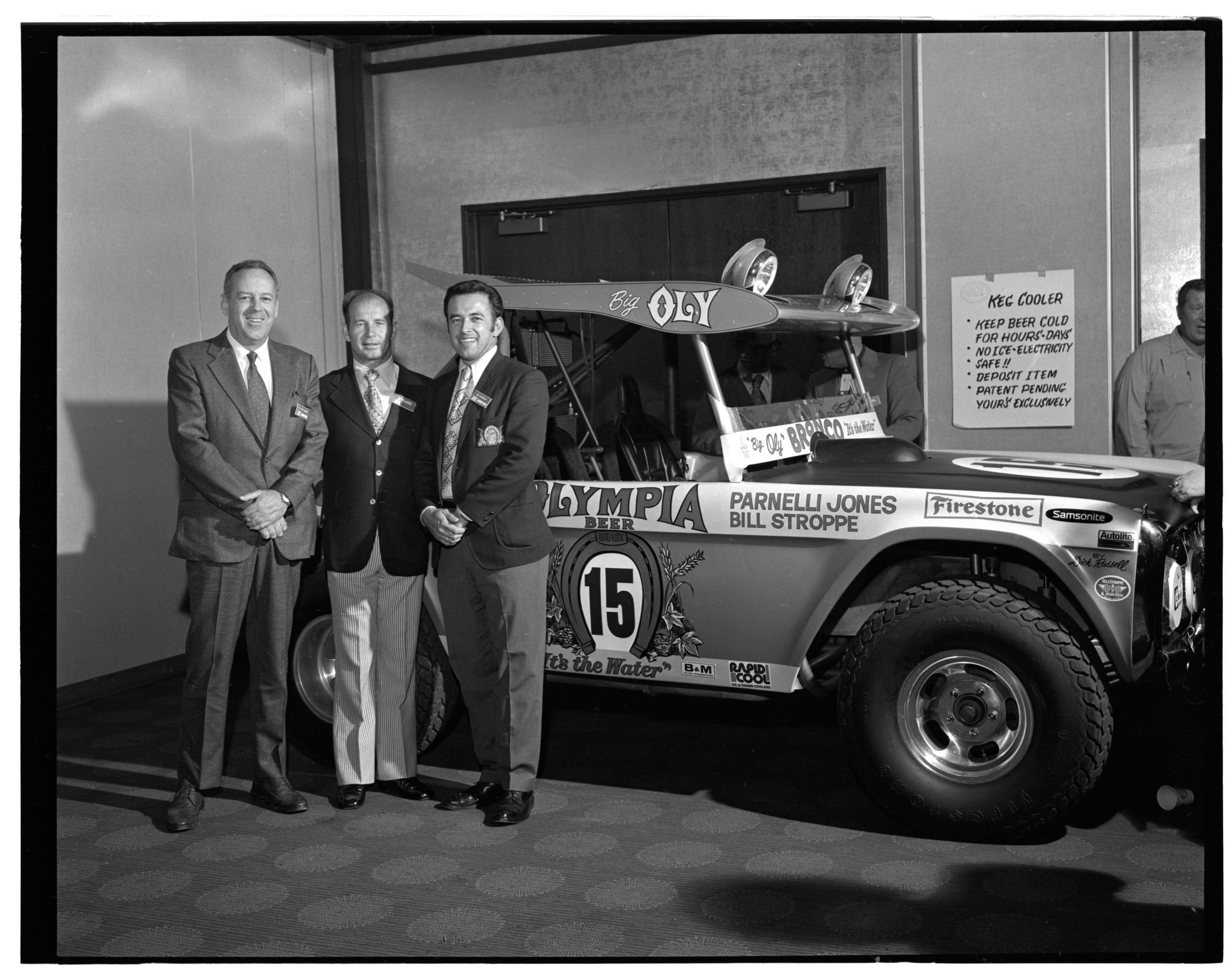 Negative, sheet film. 2 x 3 b&w. 72.131. Olympia brewery sponsored "Big Oly" race car (in races like Baja 500) driven by Parnelli Jones and Bill Stroppe. Jones is man in dark jacket and striped pants. No ID on others. Unknown location.Name/Title