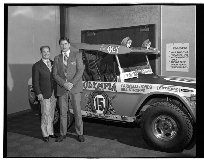 Negative, sheet film. 2 x 3 b&w. 72.131. Olympia brewery sponsored "Big Oly" race car (in races like Baja 500) driven by Parnelli Jones and Bill Stroppe. Jones is man in dark jacket and striped pants. No ID on others. Unknown location.Name/Title