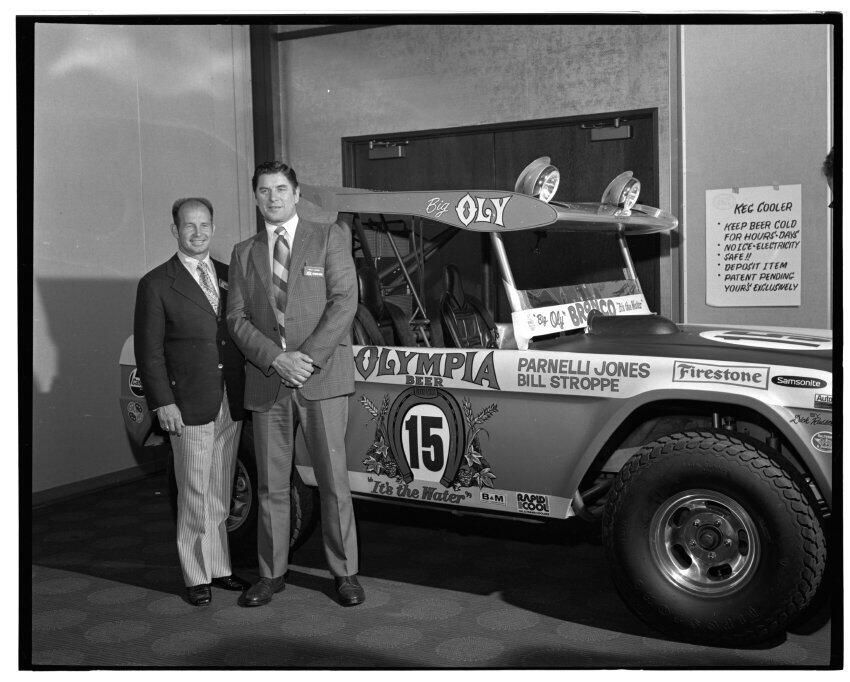 Negative, sheet film. 2 x 3 b&w. 72.131. Olympia brewery sponsored "Big Oly" race car (in races like Baja 500) driven by Parnelli Jones and Bill Stroppe. Jones is man in dark jacket and striped pants. No ID on others. Unknown location.Name/Title