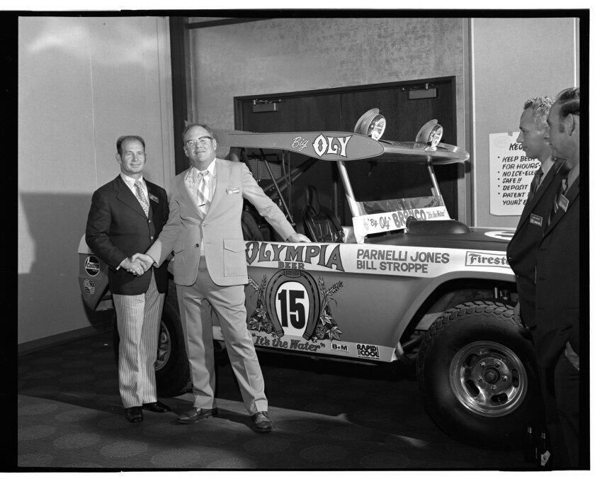 Negative, sheet film. 2 x 3 b&w. 72.131. Olympia brewery sponsored "Big Oly" race car (in races like Baja 500) driven by Parnelli Jones and Bill Stroppe. Jones is man in dark jacket and striped pants. No ID on others. Unknown location.Name/Title