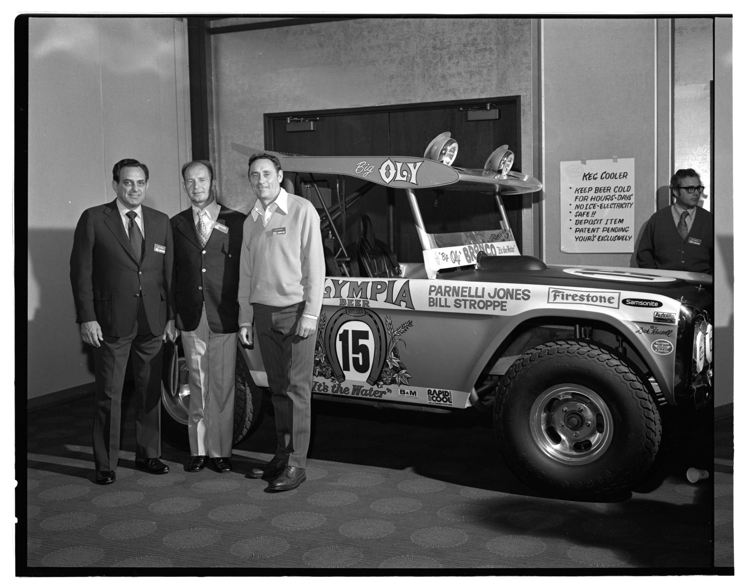 Negative, sheet film. 2 x 3 b&w. 72.131. Olympia brewery sponsored "Big Oly" race car (in races like Baja 500) driven by Parnelli Jones and Bill Stroppe. Jones is man in dark jacket and striped pants. No ID on others. Unknown location.Name/Title