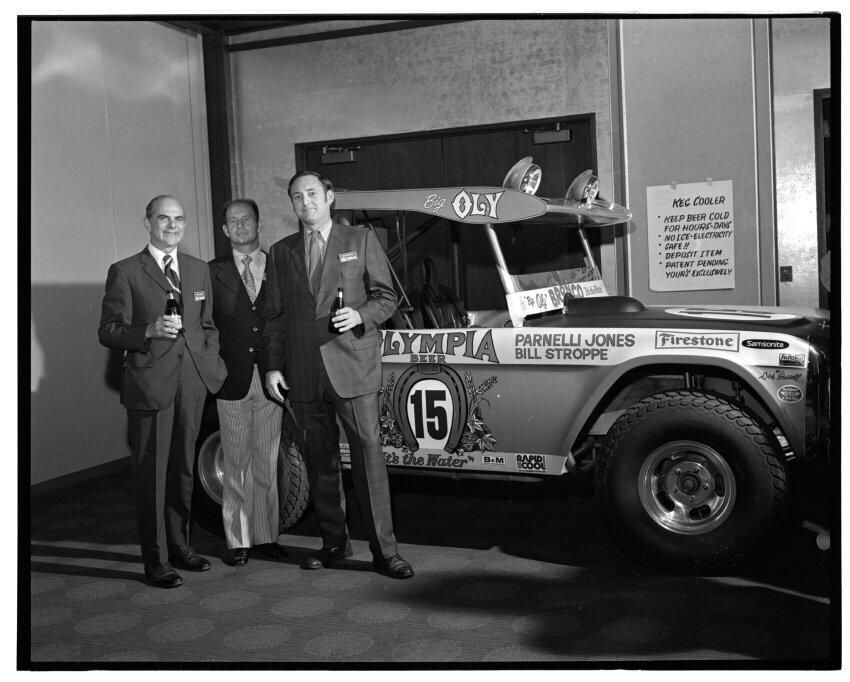 Negative, sheet film. 2 x 3 b&w. 72.131. Olympia brewery sponsored "Big Oly" race car (in races like Baja 500) driven by Parnelli Jones and Bill Stroppe. Jones is man in dark jacket and striped pants. No ID on others. Unknown location.Name/Title