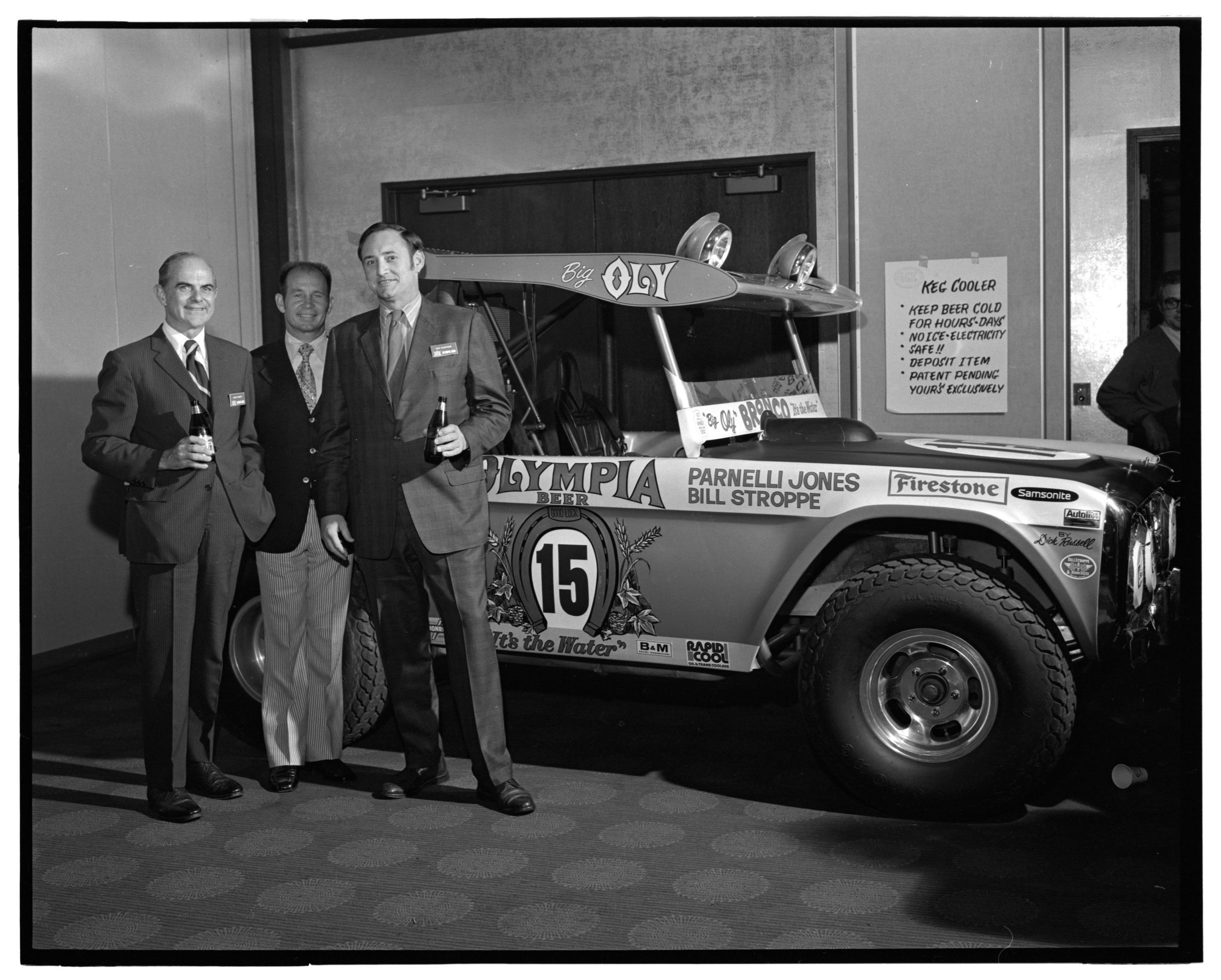Negative, sheet film. 2 x 3 b&w. 72.131. Olympia brewery sponsored "Big Oly" race car (in races like Baja 500) driven by Parnelli Jones and Bill Stroppe. Jones is man in dark jacket and striped pants. No ID on others. Unknown location.Name/Title