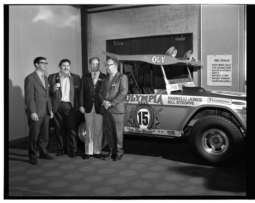 Negative, sheet film. 2 x 3 b&w. 72.131. Olympia brewery sponsored "Big Oly" race car (in races like Baja 500) driven by Parnelli Jones and Bill Stroppe. Jones is man in dark jacket and striped pants. No ID on others. Unknown location.Name/Title