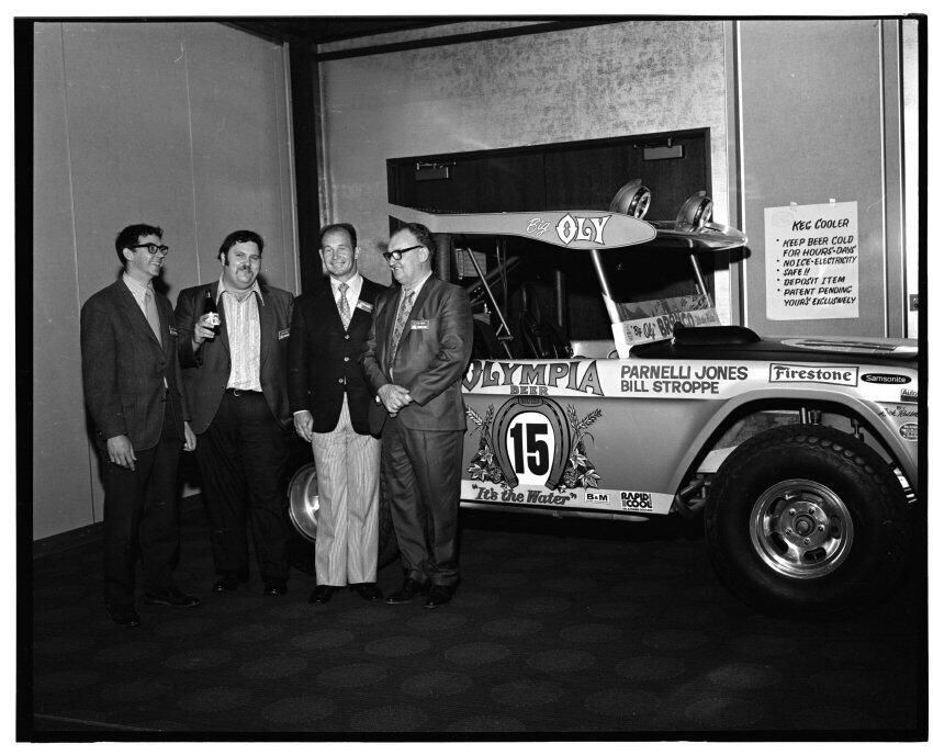 Negative, sheet film. 2 x 3 b&w. 72.131. Olympia brewery sponsored "Big Oly" race car (in races like Baja 500) driven by Parnelli Jones and Bill Stroppe. Jones is man in dark jacket and striped pants. No ID on others. Unknown location.Name/Title