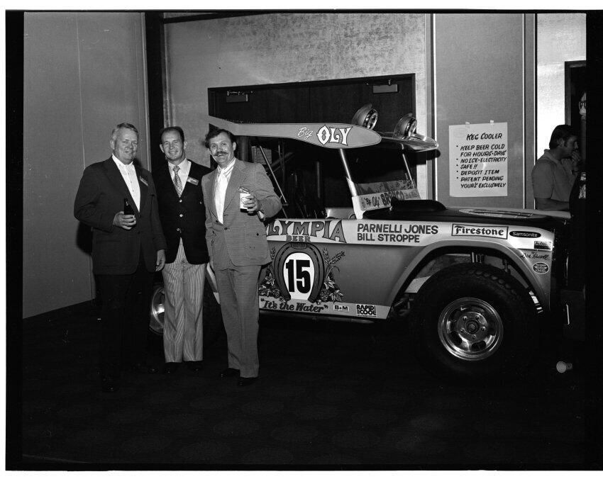 Negative, sheet film. 2 x 3 b&w. 72.131. Olympia brewery sponsored "Big Oly" race car (in races like Baja 500) driven by Parnelli Jones and Bill Stroppe. Jones is man in dark jacket and striped pants. No ID on others. Unknown location.Name/Title