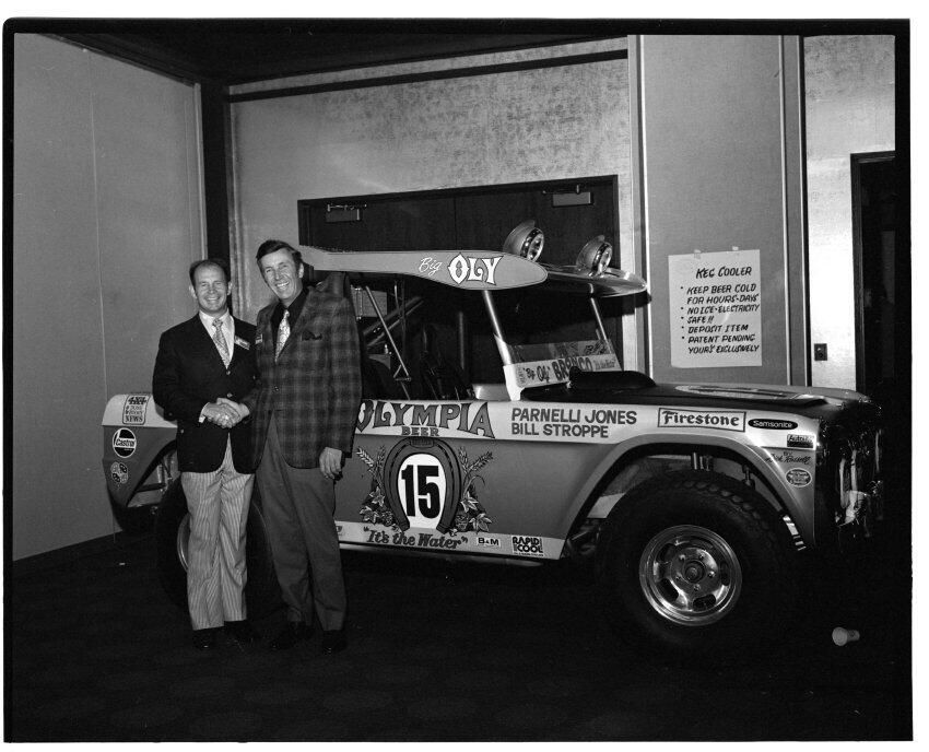 Negative, sheet film. 2 x 3 b&w. 72.131. Olympia brewery sponsored "Big Oly" race car (in races like Baja 500) driven by Parnelli Jones and Bill Stroppe. Jones is man in dark jacket and striped pants. No ID on others. Unknown location.Name/Title