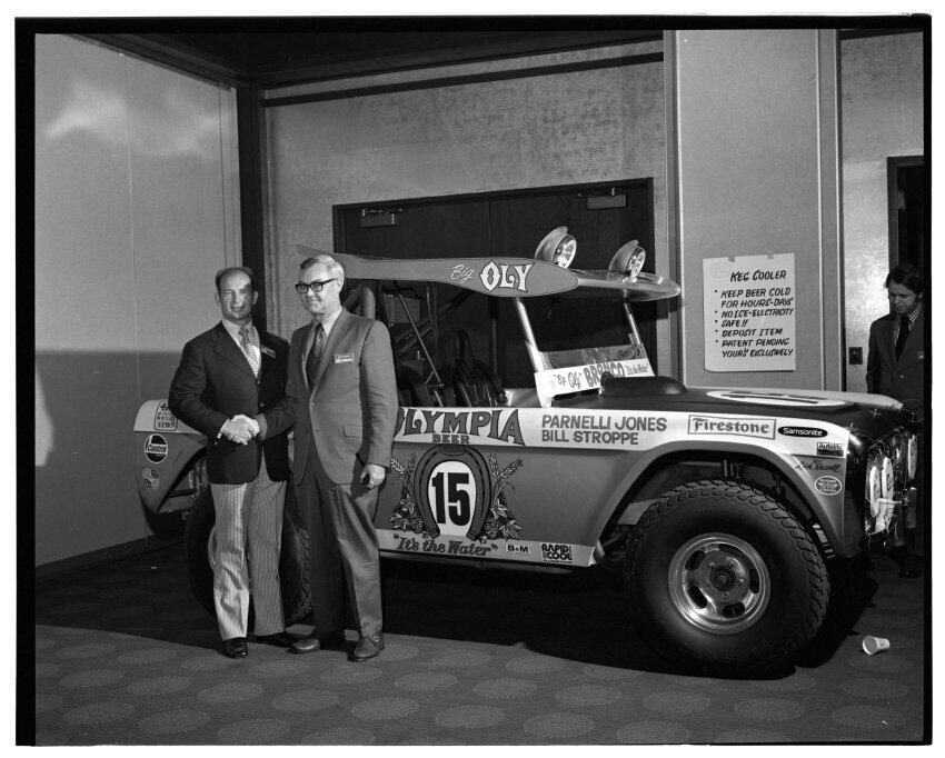 Negative, sheet film. 2 x 3 b&w. 72.131. Olympia brewery sponsored "Big Oly" race car (in races like Baja 500) driven by Parnelli Jones and Bill Stroppe. Jones is man in dark jacket and striped pants. No ID on others. Unknown location.Name/Title
