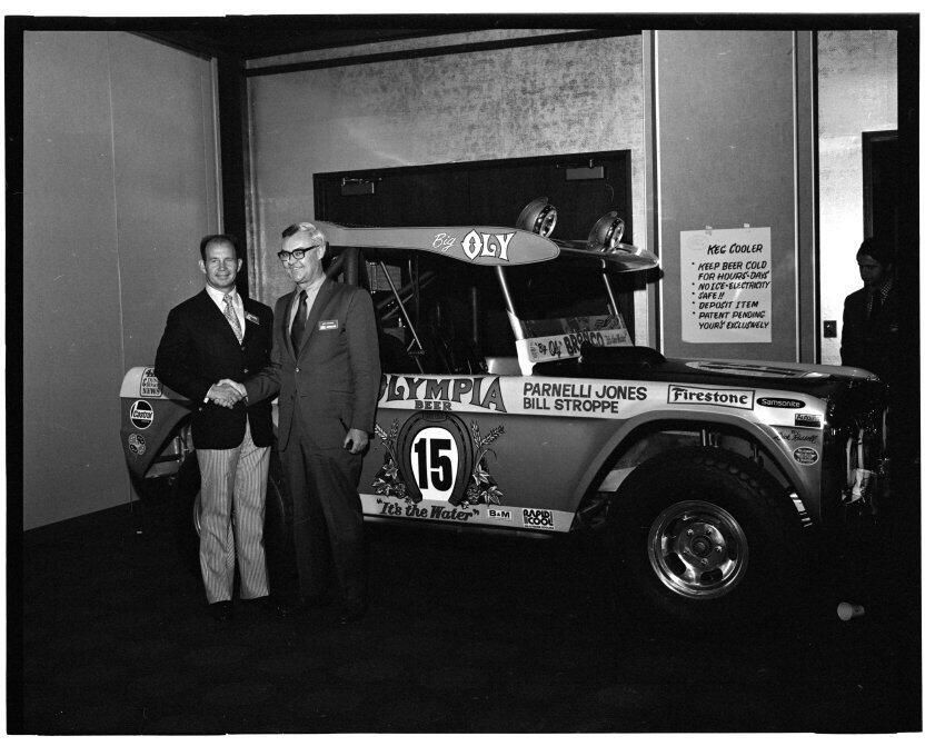 Negative, sheet film. 2 x 3 b&w. 72.131. Olympia brewery sponsored "Big Oly" race car (in races like Baja 500) driven by Parnelli Jones and Bill Stroppe. Jones is man in dark jacket and striped pants. No ID on others. Unknown location.Name/Title