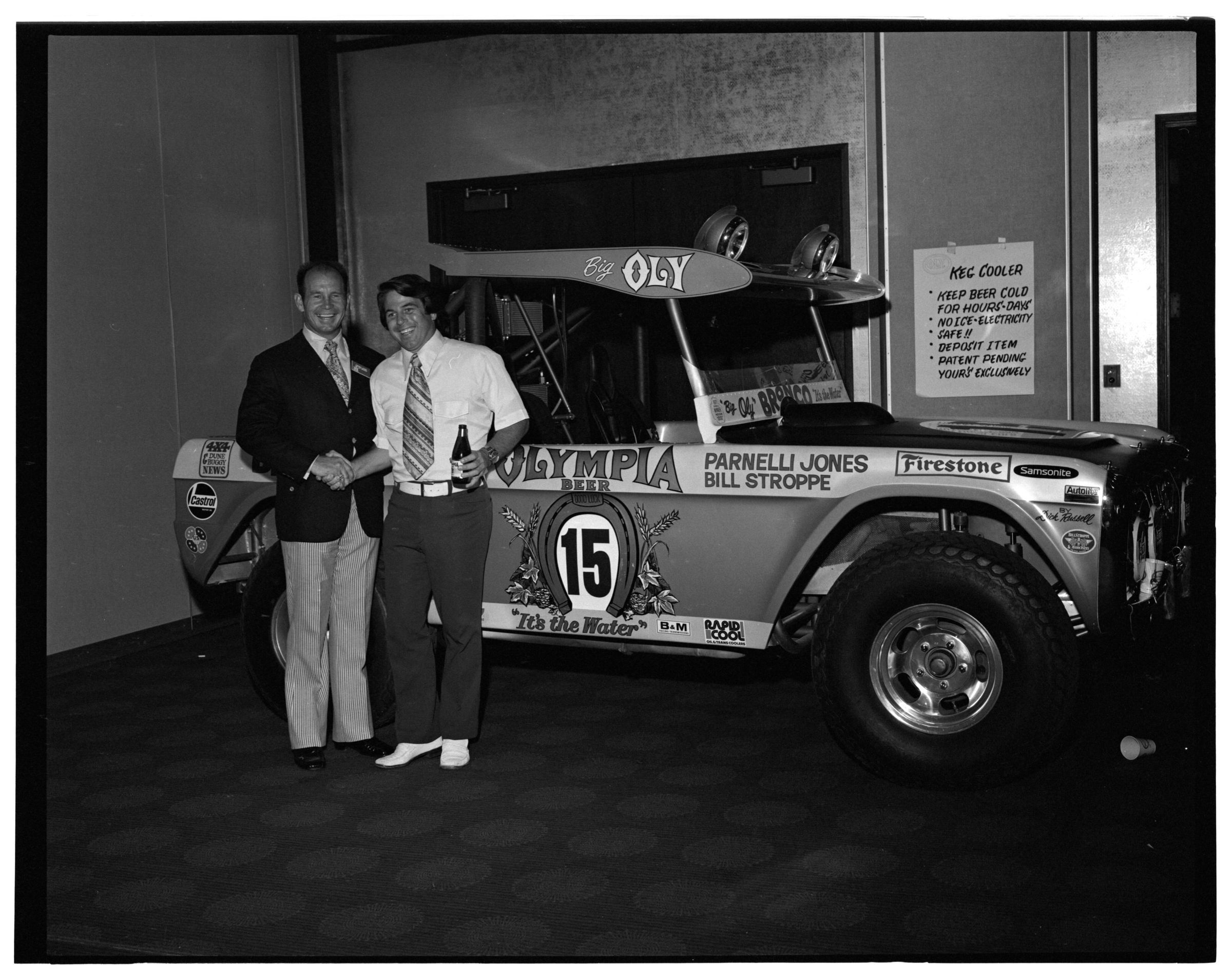 Negative, sheet film. 2 x 3 b&w. 72.131. Olympia brewery sponsored "Big Oly" race car (in races like Baja 500) driven by Parnelli Jones and Bill Stroppe. Jones is man in dark jacket and striped pants. No ID on others. Unknown location.Name/Title
