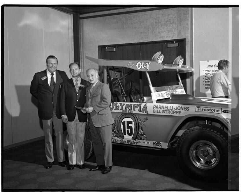 Negative, sheet film. 2 x 3 b&w. 72.131. Olympia brewery sponsored "Big Oly" race car (in races like Baja 500) driven by Parnelli Jones and Bill Stroppe. Jones is man in dark jacket and striped pants. No ID on others. Unknown location.Name/Title