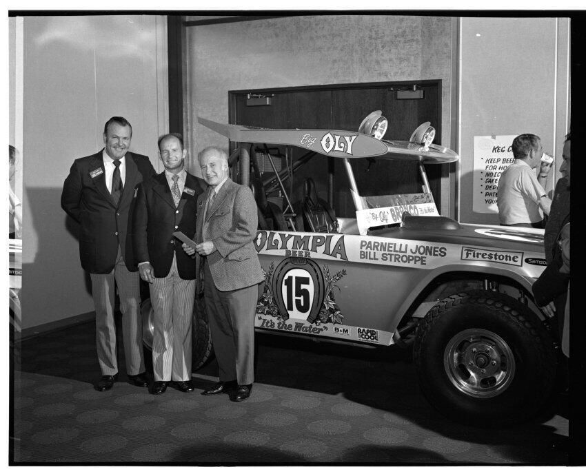 Negative, sheet film. 2 x 3 b&w. 72.131. Olympia brewery sponsored "Big Oly" race car (in races like Baja 500) driven by Parnelli Jones and Bill Stroppe. Jones is man in dark jacket and striped pants. No ID on others. Unknown location.Name/Title