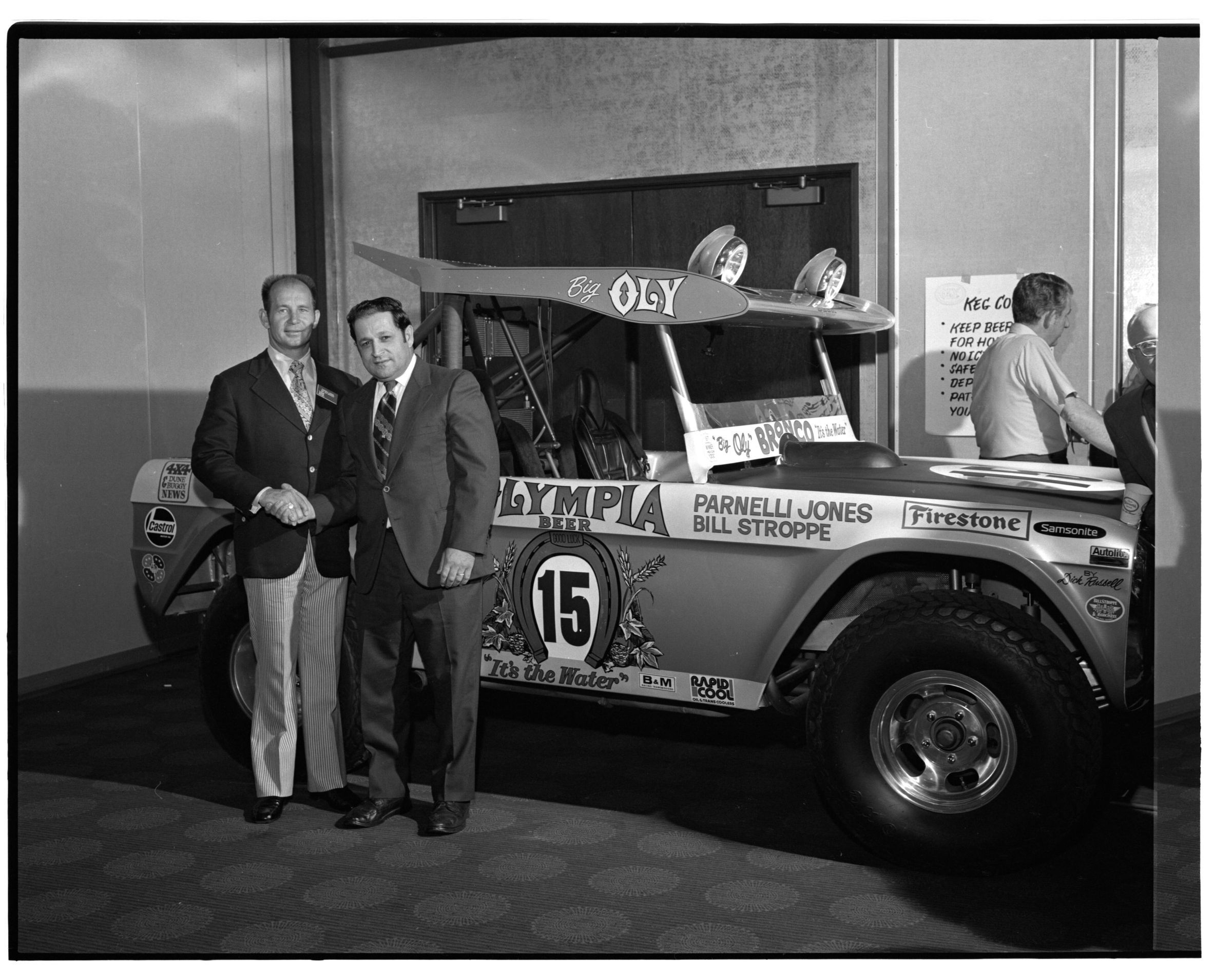 Negative, sheet film. 2 x 3 b&w. 72.131. Olympia brewery sponsored "Big Oly" race car (in races like Baja 500) driven by Parnelli Jones and Bill Stroppe. Jones is man in dark jacket and striped pants. No ID on others. Unknown location.Name/Title