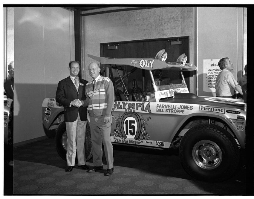 Negative, sheet film. 2 x 3 b&w. 72.131. Olympia brewery sponsored "Big Oly" race car (in races like Baja 500) driven by Parnelli Jones and Bill Stroppe. Jones is man in dark jacket and striped pants. No ID on others. Unknown location.Name/Title