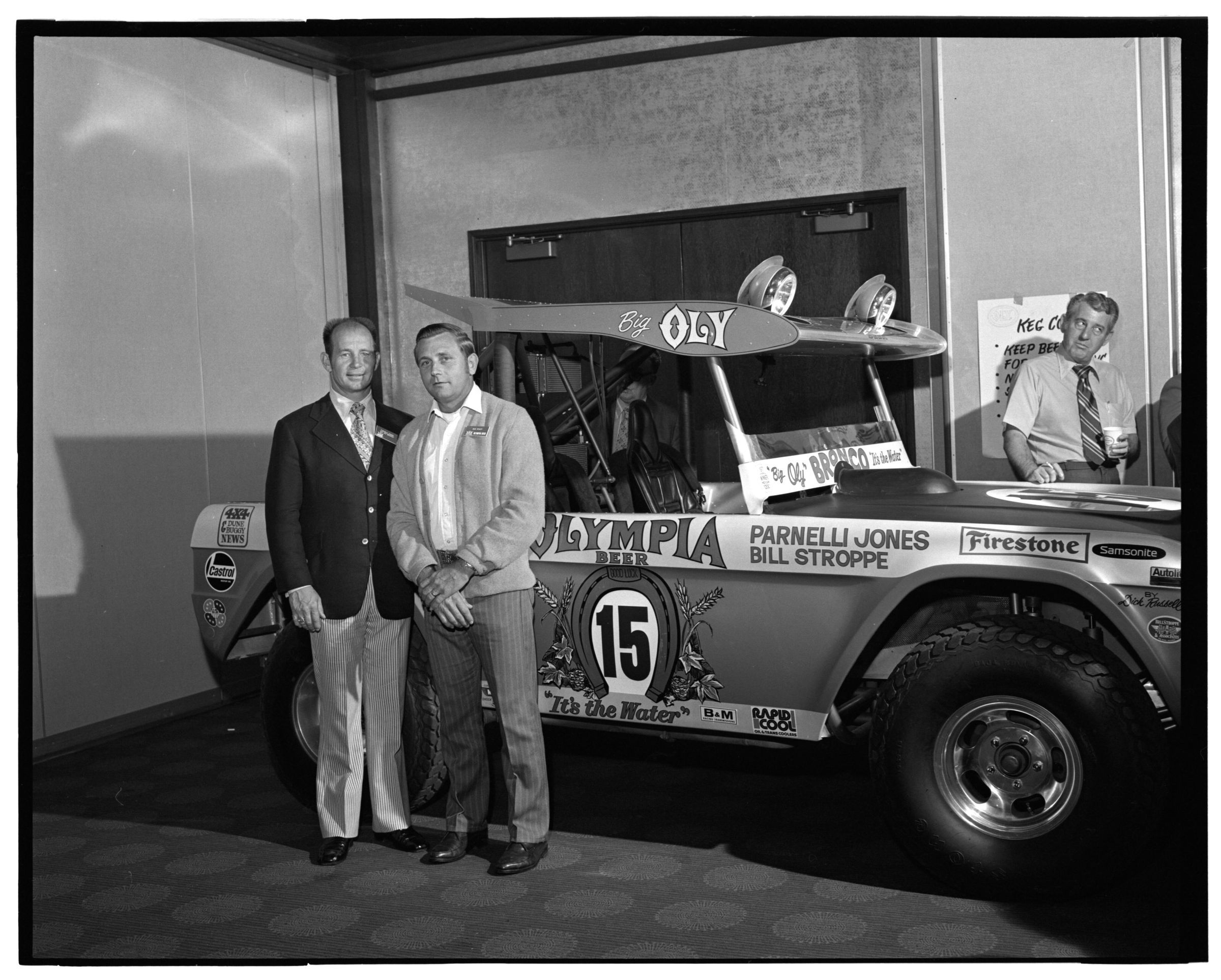 Negative, sheet film. 2 x 3 b&w. 72.131. Olympia brewery sponsored "Big Oly" race car (in races like Baja 500) driven by Parnelli Jones and Bill Stroppe. Jones is man in dark jacket and striped pants. No ID on others. Unknown location.Name/Title