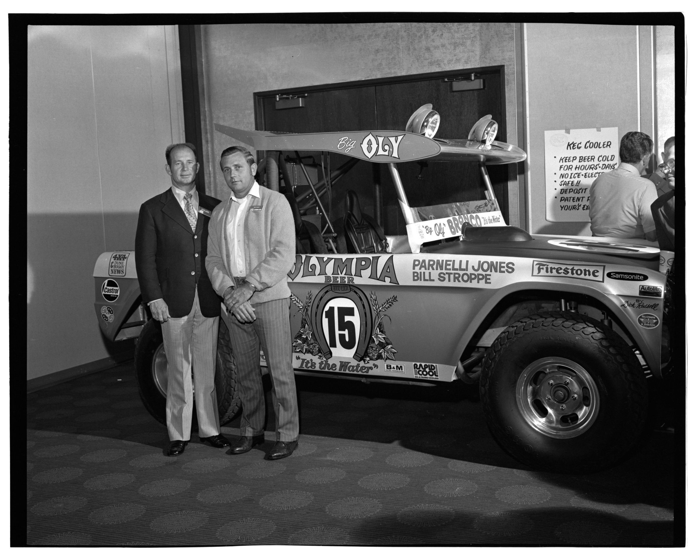 Negative, sheet film. 2 x 3 b&w. 72.131. Olympia brewery sponsored "Big Oly" race car (in races like Baja 500) driven by Parnelli Jones and Bill Stroppe. Jones is man in dark jacket and striped pants. No ID on others. Unknown location.Name/Title