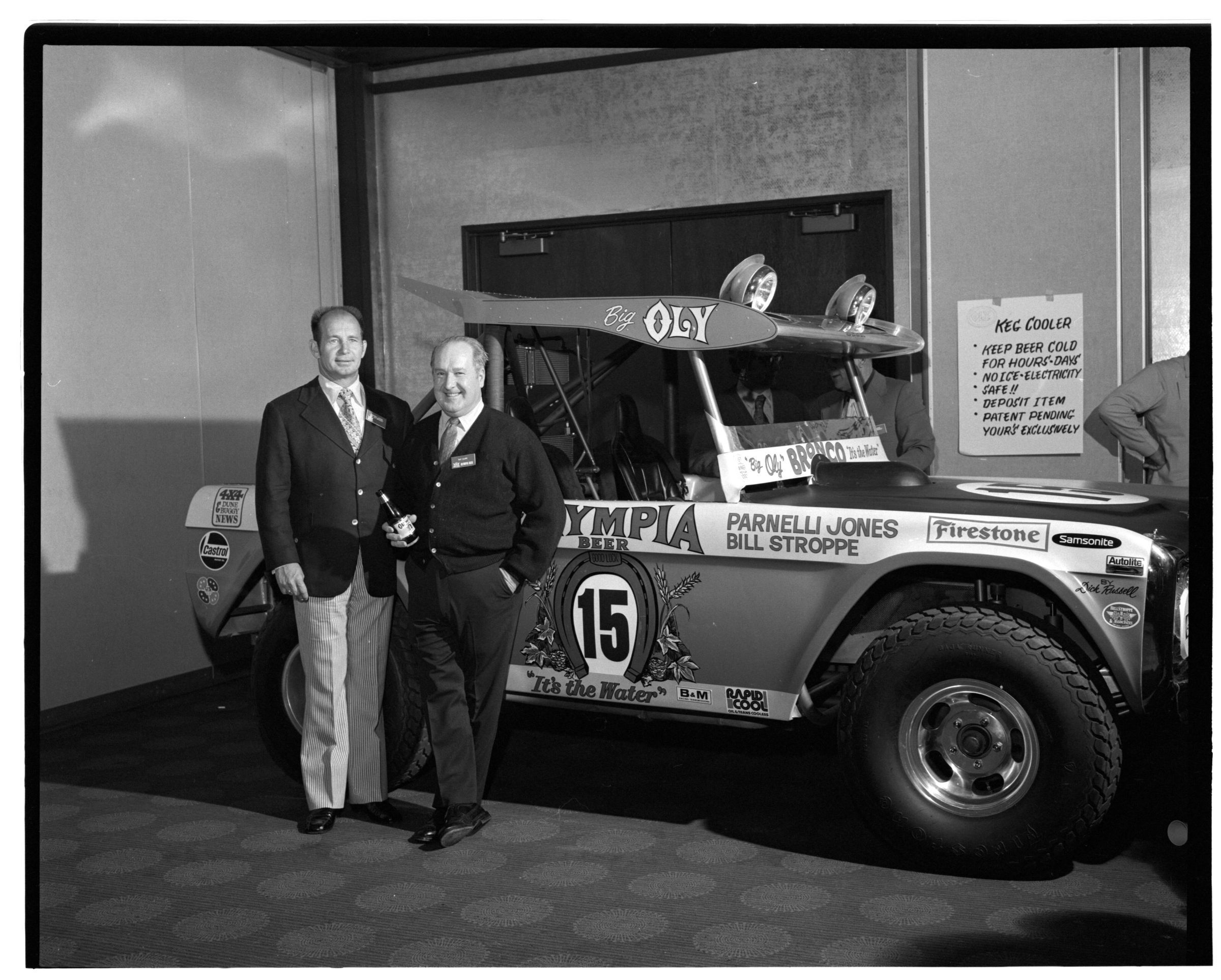 Negative, sheet film. 2 x 3 b&w. 72.131. Olympia brewery sponsored "Big Oly" race car (in races like Baja 500) driven by Parnelli Jones and Bill Stroppe. Jones is man in dark jacket and striped pants. No ID on others. Unknown location.Name/Title