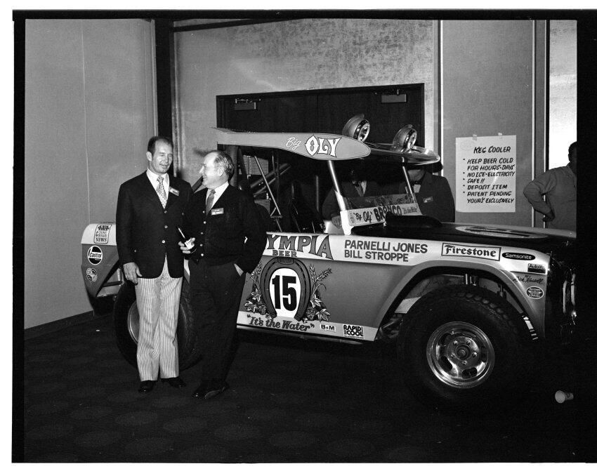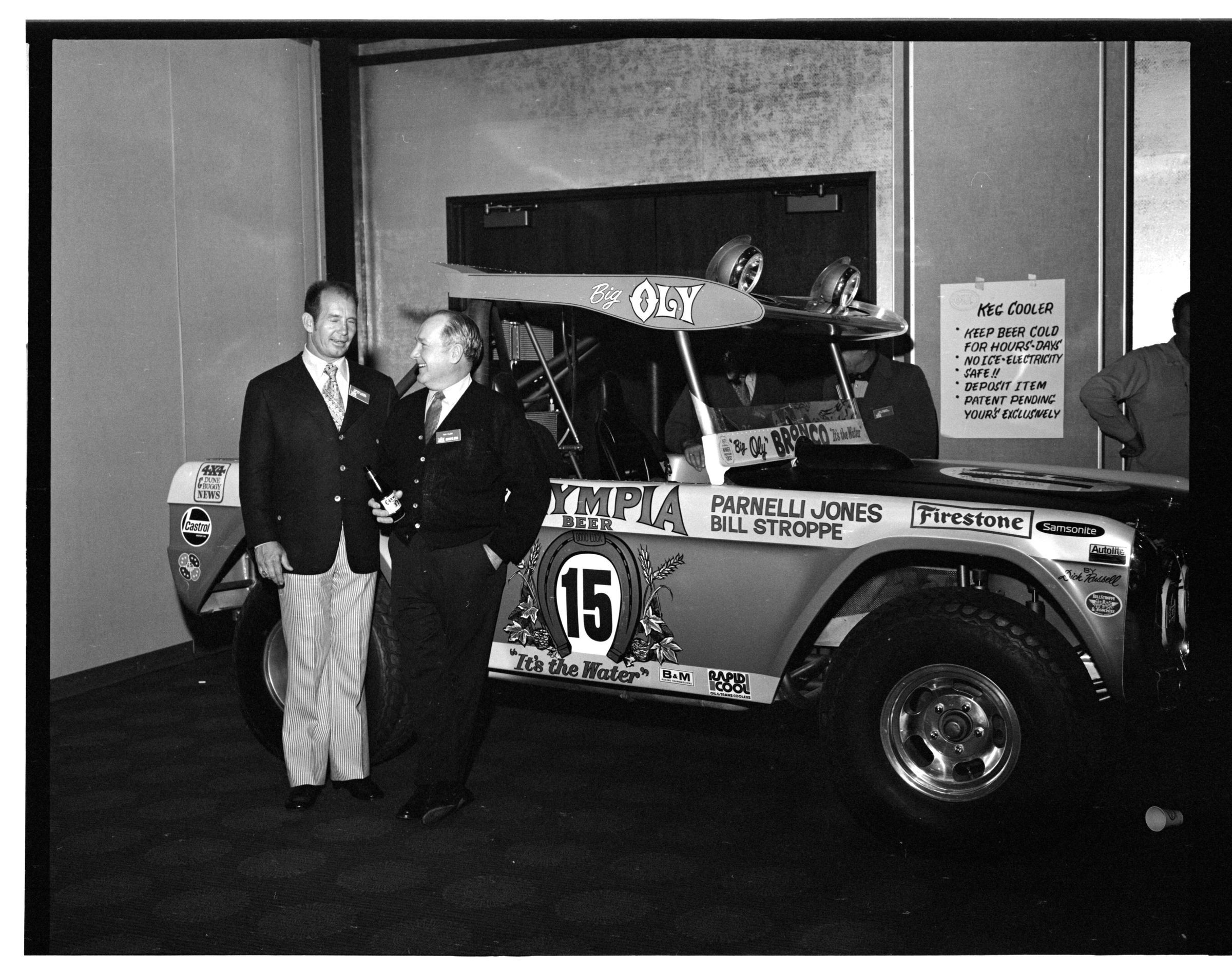 Negative, sheet film. 2 x 3 b&w. 72.131. Olympia brewery sponsored "Big Oly" race car (in races like Baja 500) driven by Parnelli Jones and Bill Stroppe. Jones is man in dark jacket and striped pants. No ID on others. Unknown location.Name/Title