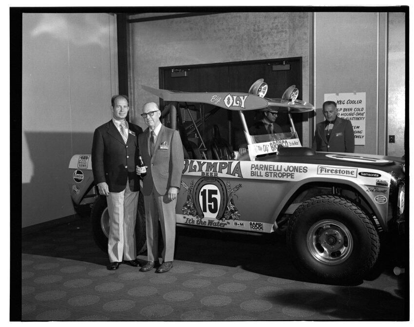 Negative, sheet film. 2 x 3 b&w. 72.131. Olympia brewery sponsored "Big Oly" race car (in races like Baja 500) driven by Parnelli Jones and Bill Stroppe. Jones is man in dark jacket and striped pants. No ID on others. Unknown location.Name/Title