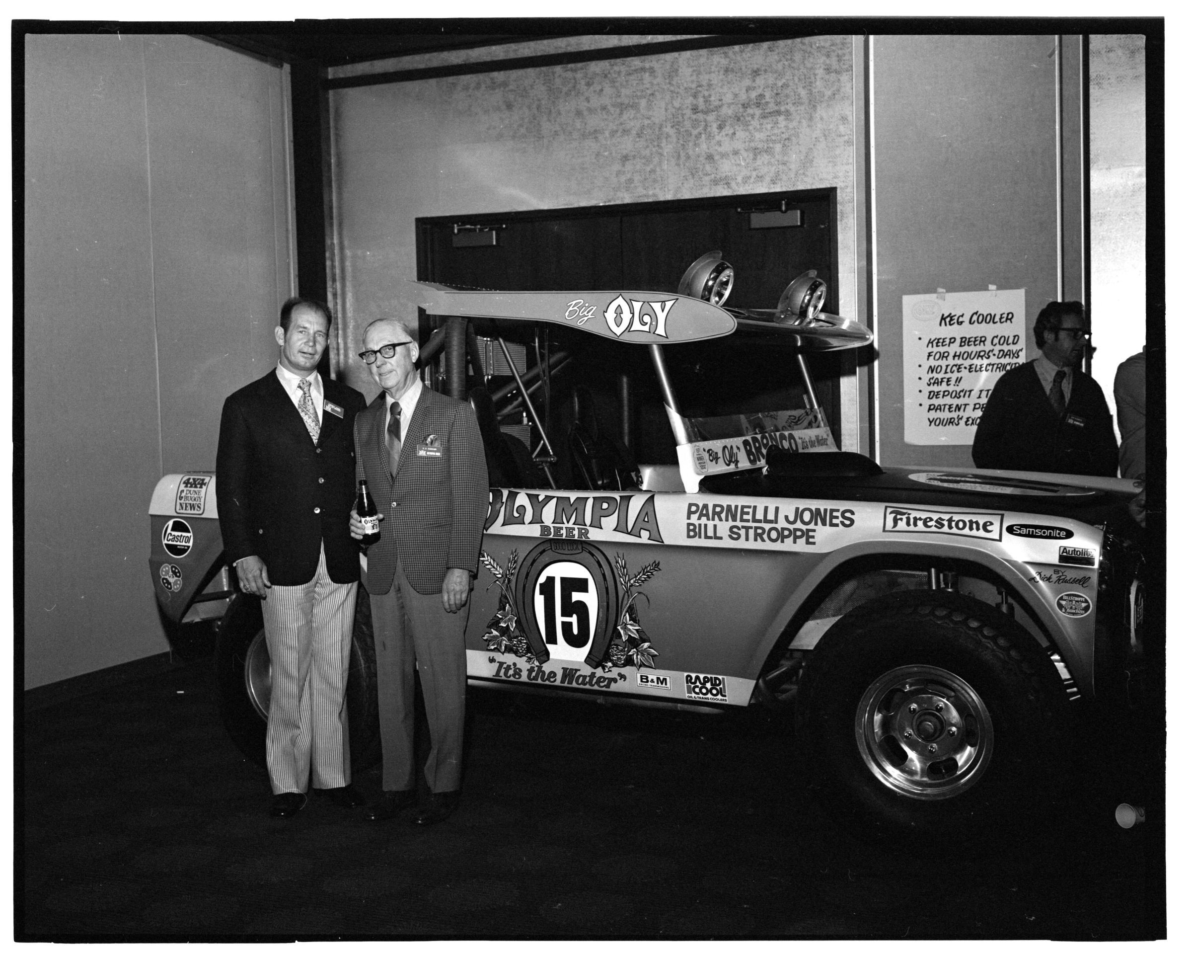 Negative, sheet film. 2 x 3 b&w. 72.131. Olympia Brewery. Parnelli Jones and Bill Stroppe's Big Oly.Olympia brewery sponsored "Big Oly" race car (in races like Baja 500) driven by Parnelli Jones and Bill Stroppe. Jones is man in dark jacket and striped pants. No ID on others. Unknown location.Name/Title