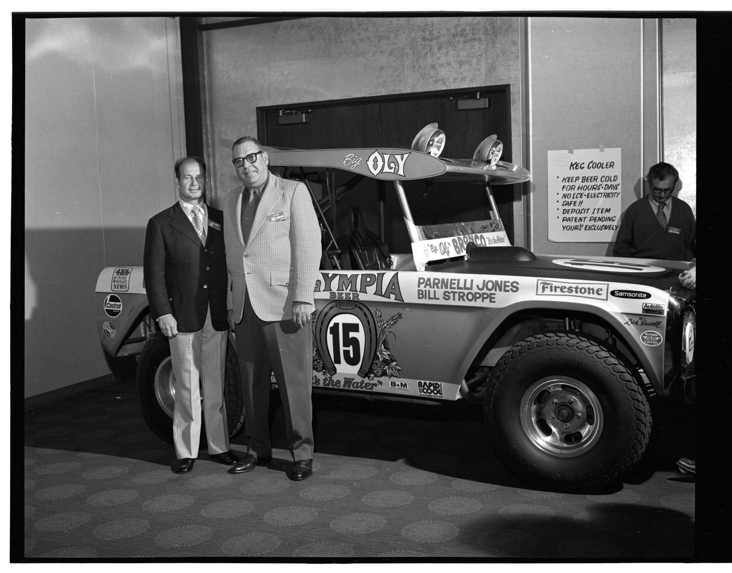 Negative, sheet film. 2 x 3 b&w. 72.131. Olympia brewery sponsored "Big Oly" race car (in races like Baja 500) driven by Parnelli Jones and Bill Stroppe. Jones is man in dark jacket and striped pants. No ID on others. Unknown location.Name/Title