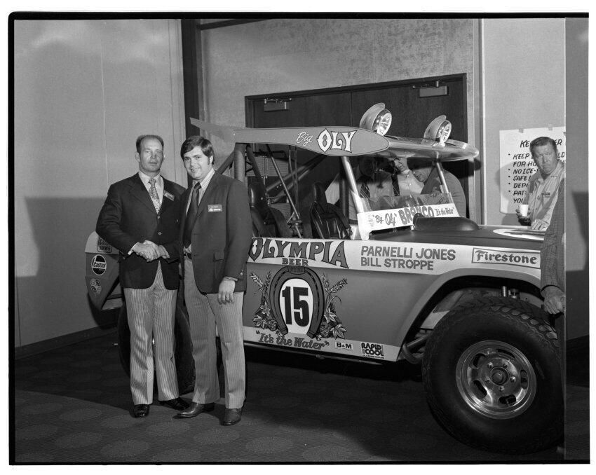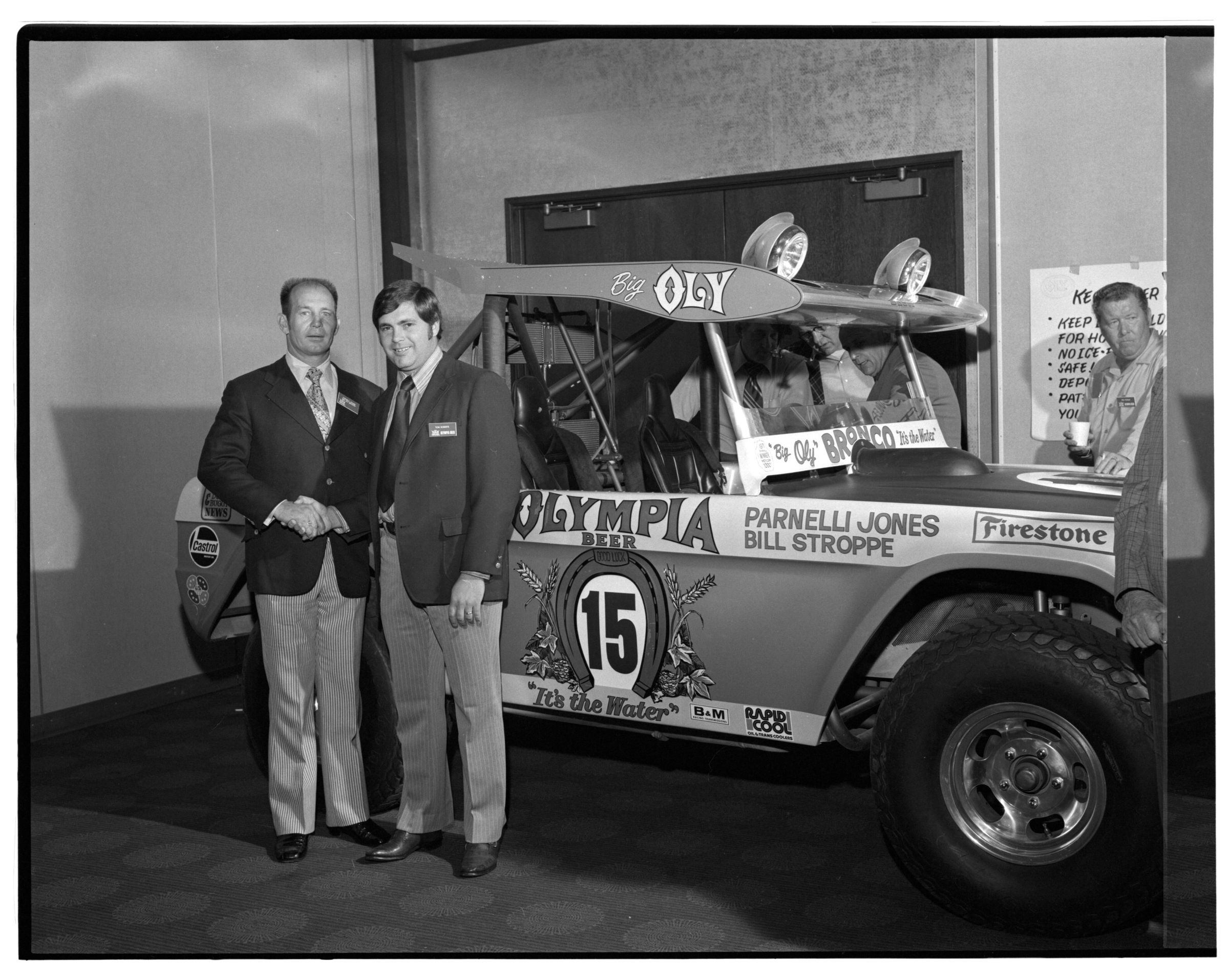Negative, sheet film. 2 x 3 b&w. 72.131. Olympia brewery sponsored "Big Oly" race car (in races like Baja 500) driven by Parnelli Jones and Bill Stroppe. Jones is man in dark jacket and striped pants. No ID on others. Unknown location.Name/Title
