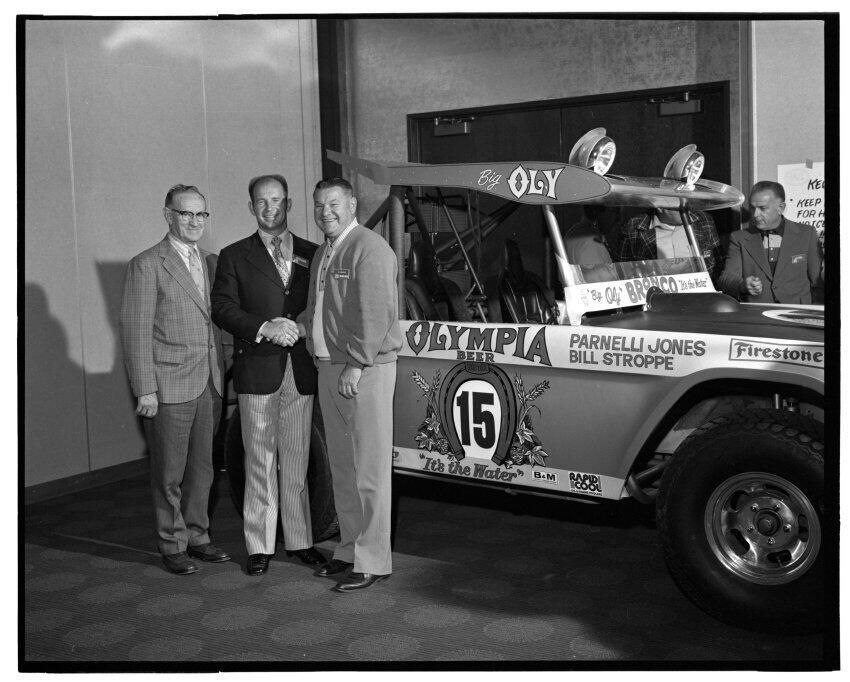 Negative, sheet film. 2 x 3 b&w. 72.131. Olympia brewery sponsored "Big Oly" race car (in races like Baja 500) driven by Parnelli Jones and Bill Stroppe. Jones is man in dark jacket and striped pants. No ID on others. Unknown location.Name/Title