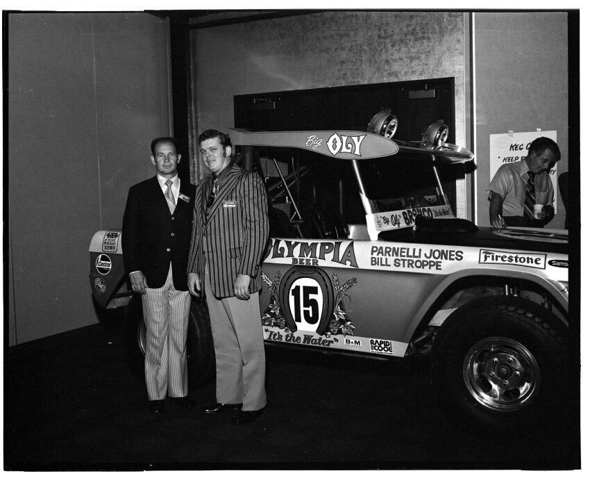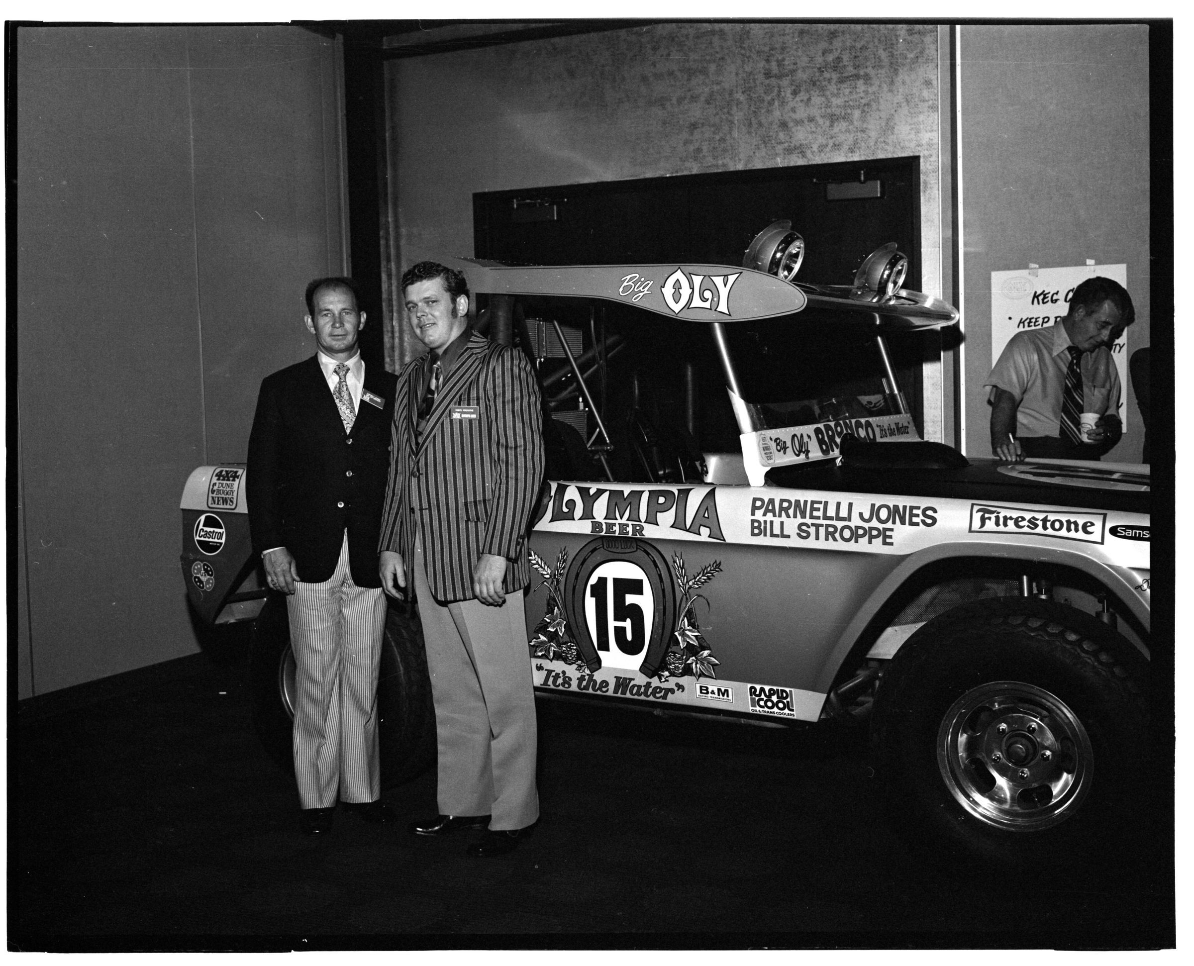 Negative, sheet film. 2 x 3 b&w. 72.131. Olympia brewery sponsored "Big Oly" race car (in races like Baja 500) driven by Parnelli Jones and Bill Stroppe. Jones is man in dark jacket and striped pants. No ID on others. Unknown location.Name/Title