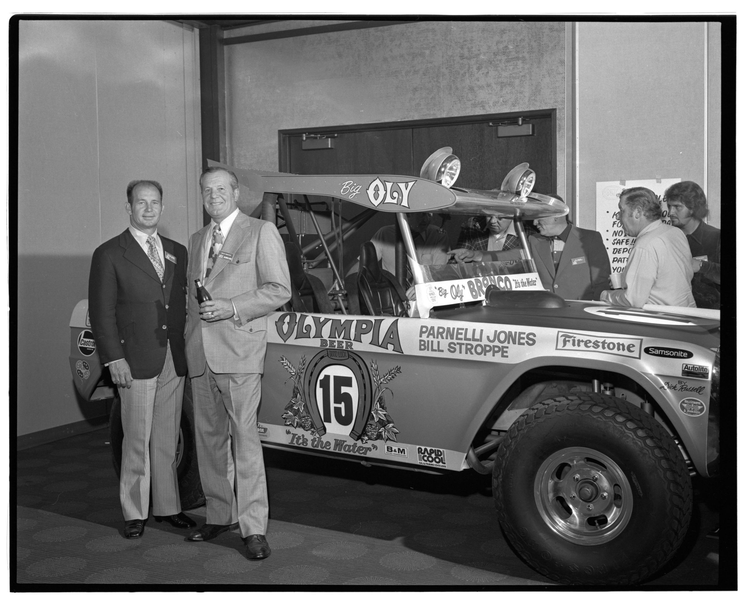 Negative, sheet film. 2 x 3 b&w. 72.131. Olympia Brewery. Parnelli Jones and Bill Stroppe's Big Oly.Olympia brewery sponsored "Big Oly" race car (in races like Baja 500) driven by Parnelli Jones and Bill Stroppe. Jones is man in dark jacket and striped pants. No ID on others. Unknown location.Name/Title