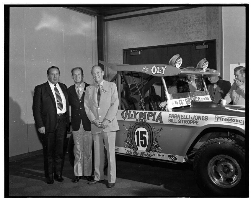 Negative, sheet film. 2 x 3 b&w. 72.131. Olympia brewery sponsored "Big Oly" race car (in races like Baja 500) driven by Parnelli Jones and Bill Stroppe. Jones is man in dark jacket and striped pants. No ID on others. Unknown location.Name/Title