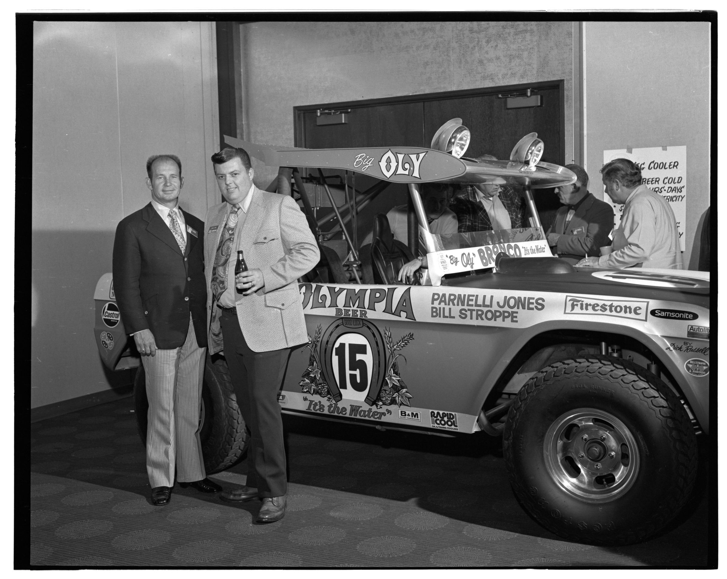 Negative, sheet film. 2 x 3 b&w. 72.131. Olympia brewery sponsored "Big Oly" race car (in races like Baja 500) driven by Parnelli Jones and Bill Stroppe. Jones is man in dark jacket and striped pants. No ID on others. Unknown location.Name/Title