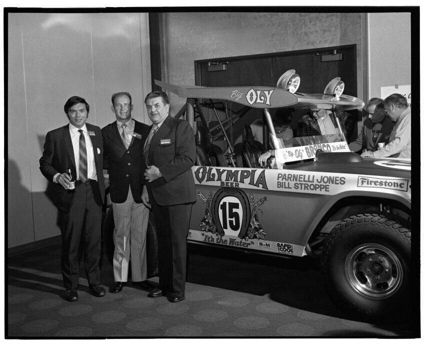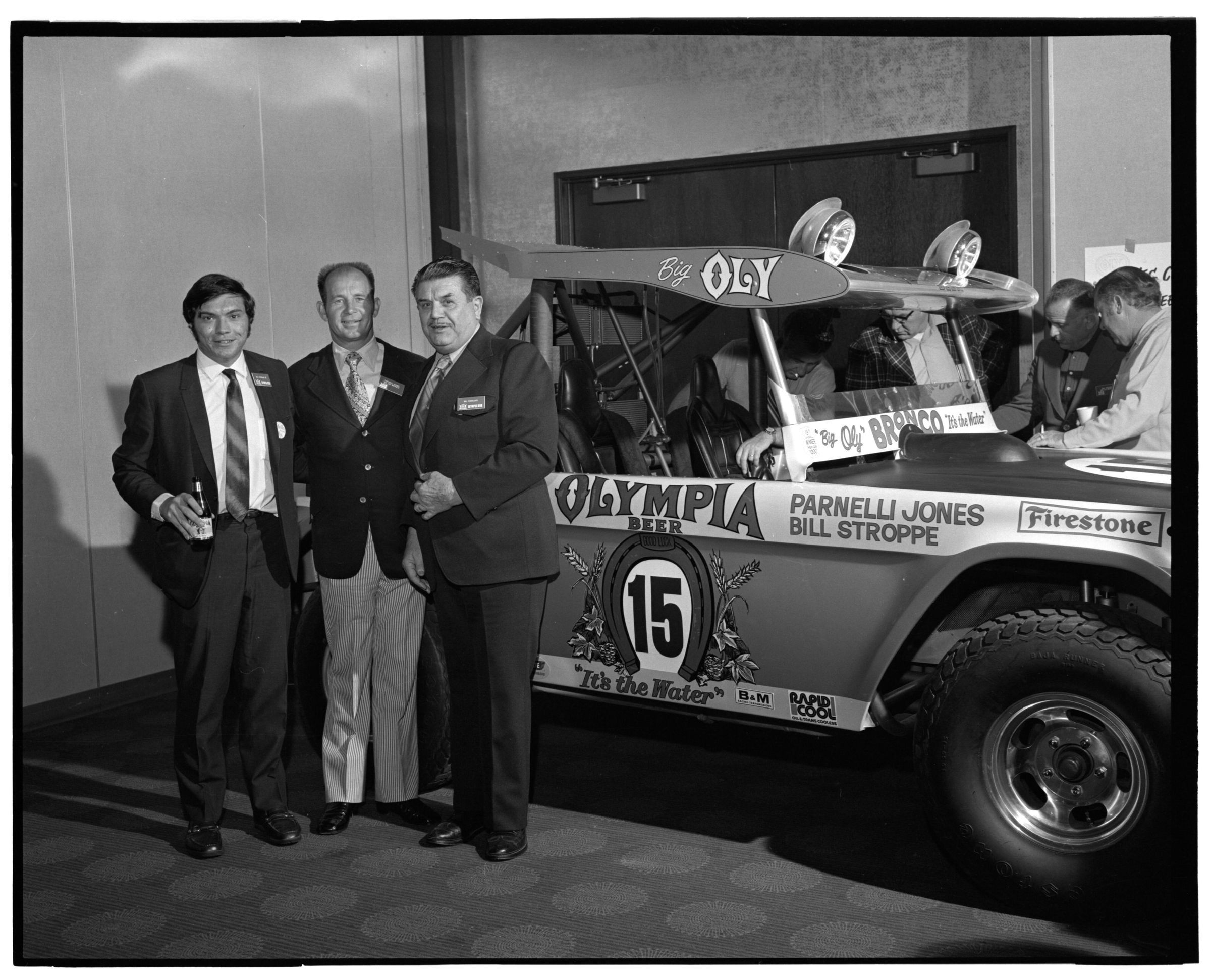 Negative, sheet film. 2 x 3 b&w. 72.131. Olympia brewery sponsored "Big Oly" race car (in races like Baja 500) driven by Parnelli Jones and Bill Stroppe. Jones is man in dark jacket and striped pants. No ID on others. Unknown location.Name/Title